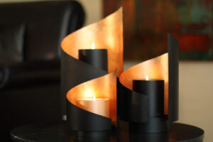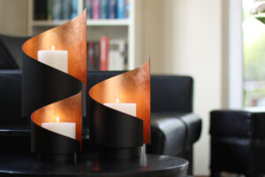 Die segelartige, nach oben strebende Form verleiht dem Kerzenhalter eine besondere Dynamik. Die aufwendig veredelte Innenseite reflektiert das Kerzenlicht sanft und taucht den Raum in ein stimmungsvolles, warmes Leuchten. 100% handgefertig in Europa.